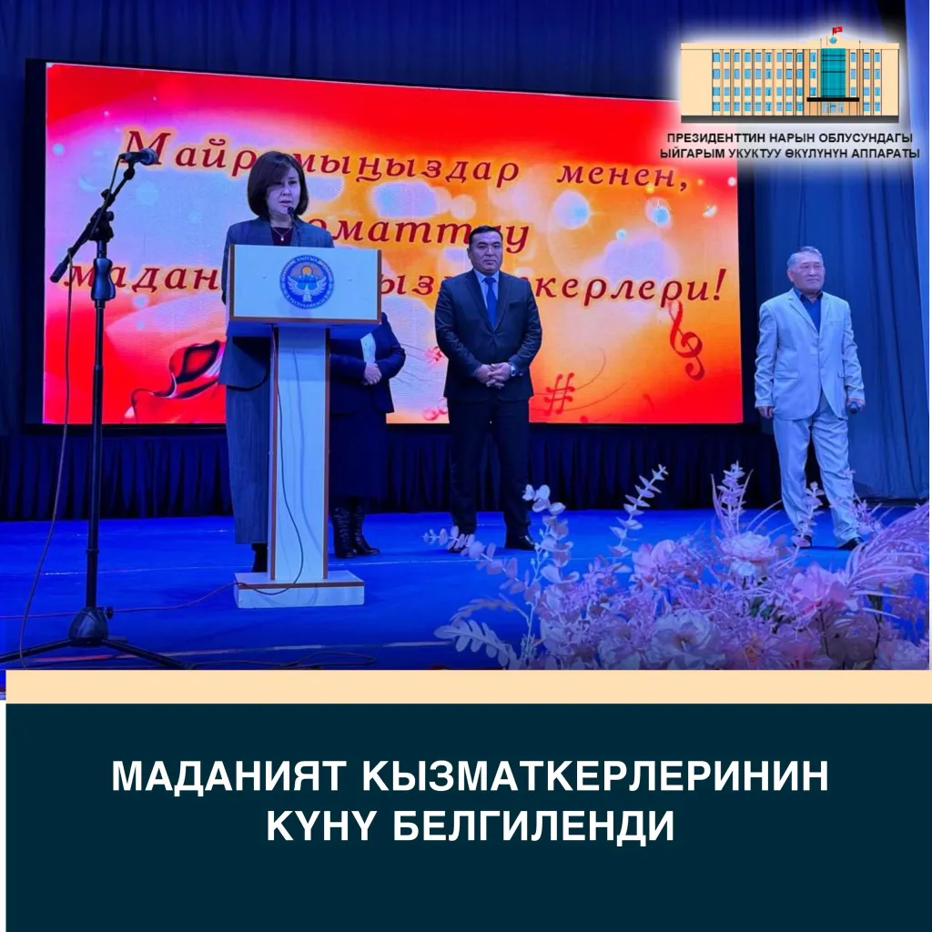6-ноябрь күнү Нарында Маданият кызматкерлеринин кесиптик майрамы белгиленди.Иш-чарага Президенттин Нарын облусундагы ыйгарым укуктуу өкүлүнүн орун басары Айдана Иманалиева катышып, куттуктоо сөзүн сүйлөп, маданият тармагынын өнүгүшүнө салым кошкон бир кат